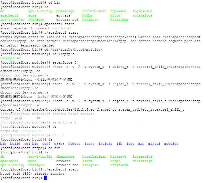 # chcon -c -v -R -u system_u -r object_r -t textrel_shlib_t /usr/local/apache/modules/libphp5.so