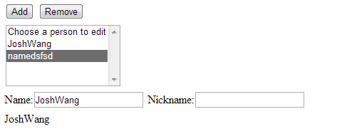 代码说明:点击Add按钮,会添加一条记录到Array中,然后该template就会自动更新并显示出新加的这一行。使用的code是:$.observable(people).insert(people.length, {name: "name"});