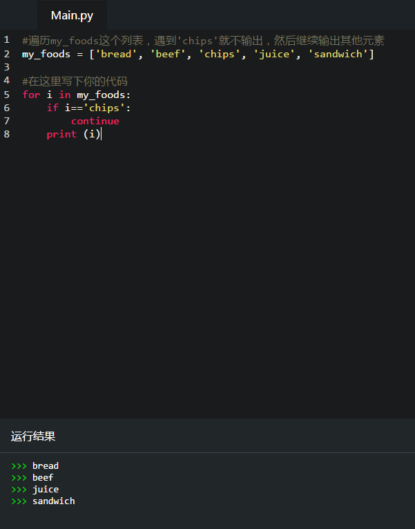 continue语句是用来告诉程序跳出本次循环,然后执行下一轮循环,不同与break,break是跳出整个循环,continue是结束这一次循环,继续下一次循环。
