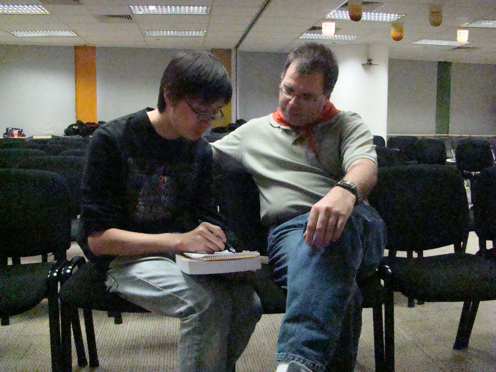 Jeffery是个亲切而可爱的人,来会的每个人都有幸得到Jeffery的签名,他也非常乐意和每个人合照留影,并且摆出很多好玩的Pose,让一个下午的技术会议变得异常快乐。作为国际魔术师协会的会员,虽然没有领略Jeffery来一次近景纸牌魔术表演,但是他的技术演讲《Building Responsive and Scalable Applications》同样精彩,也留给我们很多的问答机会。哈哈,我也没有错过这种直接对话的机会,两个问题虽然简单但是足以给我一点思考。会后我也专程找大师要来签名,更重要的是,Jeffery不介意任何技术细节的盘问,我也在繁忙的会场找到Jeffery亲自指导了内存部分的一个细节问题,Jeffery很仔细的为我的草稿做了注解,这绝对是书上没有的,哈哈,我是不是赚到了:-)
