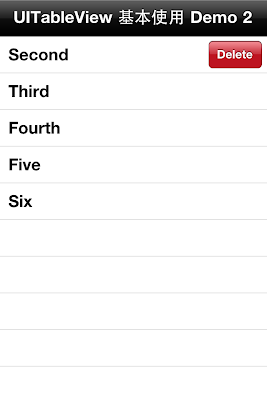 当我们起始删除功能之后,就可以利用手指划过 UITableViewCell 来进行删除的动作。接下来,置入以下方法,tableView: commitEditingStyle: forRowAtIndexPath:,此方法为根据 UITableView 回传的编辑模式,进行对应的处理方法。