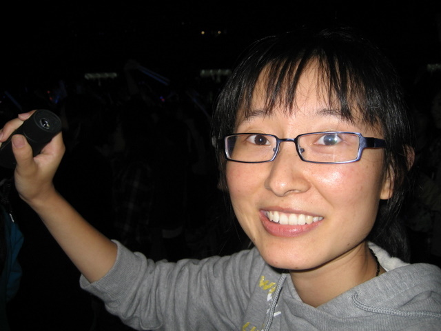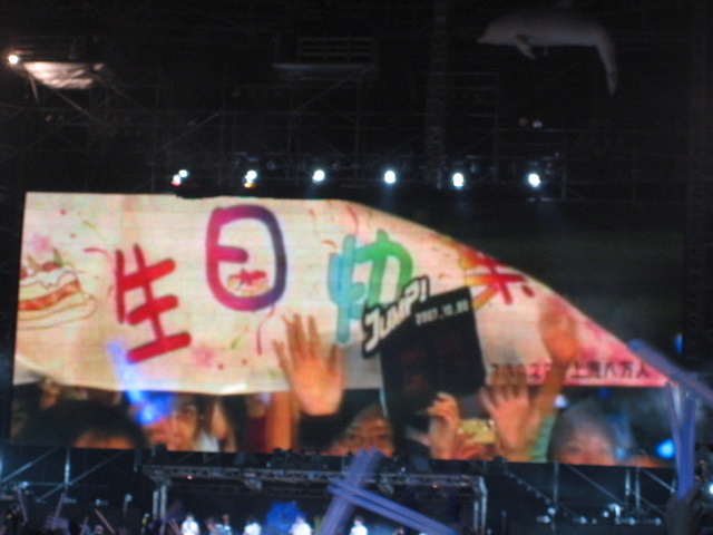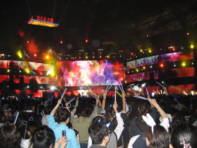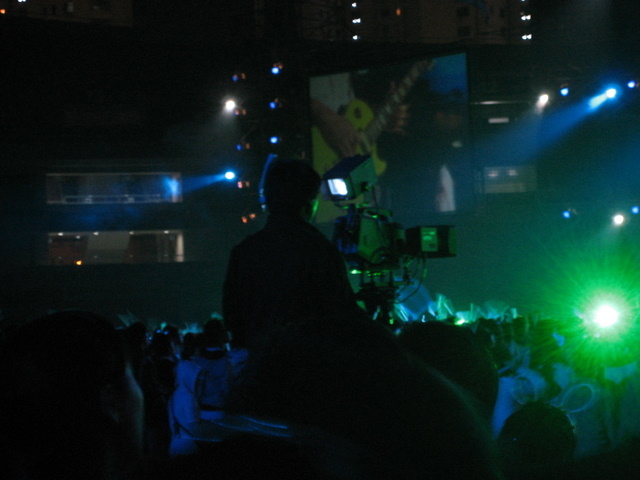 周六麻麻有个ISO什么什么的培训,所以显得时间比较赶,要不然,她同事就能见见我这神秘人物啦~嘿嘿~ 我们在东方既白简单吃了点之后,就赶往上海体育场,一到那里,真人人山人海,一时找不到进口,很底层的入口处保安指路不利加上另外一边的保安检票不利,导致我们进了看台区域,结果后来还是有一个较好心的保安把我们带进了内场,不过还好,趁机上了下厕所,所以不算太亏,只是进场的时候,荧光棒被没收了,第一次见市面,没有经验啊~!不过后来实践证明下来,没有荧光棒也并无大碍,一来我们手头上有两个照相机,两个包,一个望远镜,拿荧光棒也不方便,二来荧光棒肯定会影响我们后面歌友们的视线,我们争做文明好观众~ :D