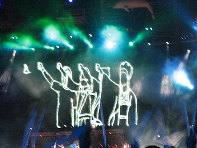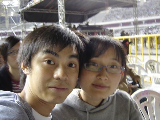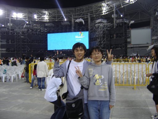 4个小时的演唱会仿佛一转眼,到最后的时候,五月天和大家告别,后面的女生哭了,麻麻很坚强的,麻麻不哭的,哈哈~~足足站在椅子上四个小时哦,看来,年轻人的体力真是好啊~ 不过年轻人年轻气盛,多少有些不文明的地方,会后随地扔荧光棒现象有待改进,还是我们比较文明,不留任何杂物~ :D 找啊找啊找啊找,终于找到人帮我们拍了张合影,哈哈~不错~