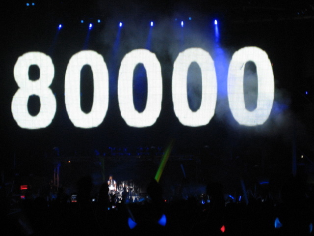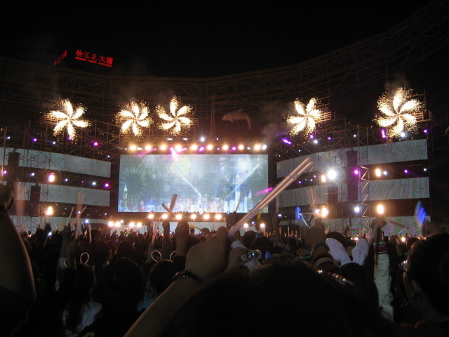 突然灯暗了。。。别慌,不是断电,是演唱会要开始了~ 随着这灯一关啊,看台上煞是好看~ 都是蓝色的荧光棒,好象是天空中的点点星光(按照地理位置来讲,看台在我们视野的向上45度左右,所以还是比较像天空滴)~