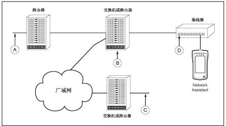 在这个测试应用中,A、B、C、D分别是可以选择进行测试的接入点,它们与集线器上接入的测试仪可以组成不同的链路,通过对这些链路的吞吐量测试可以相应的网络瓶颈和发现性能问题的网段。