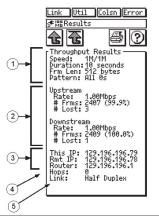 2、这部分以上、下行的方式分别显示了实际的传输速率、成功传输的百分百以及测试中丢失帧的数量,这是测试仪根据①的设置进行测试的结果。