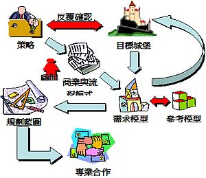 通 常目标城堡对应到实际信息需求时会不够精准,同时对于企业经营层的主管来说,很多需求与知识不见得能够清楚交代。因此将目标城堡以类似积木手法快速建模 后,所有的人员才能够真正认识彼此的想法。有了这个抽象的模型,也才能帮助大家思考,所定义的需求是否能够符合企业的经营策略以及商业与流程模式。在此步 骤中采用适当的参考模型,当可大大缩减建模时间,同时也可帮助企业获得 best practice 的知识与经验。