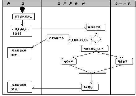 · 活动图( Active Diagrams )用图形的方式来对商业使用的案例进行工作流程建模。表示出工作流程的步骤,工作流程中的决策点,谁负责完成每个步骤,哪个对象受到此工作流程的影响。例 如一个客户收到一个有缺陷的产品并要求退款,客户服务部受理该事务,这一系列活动用 UML 图中的活动图表示如下: