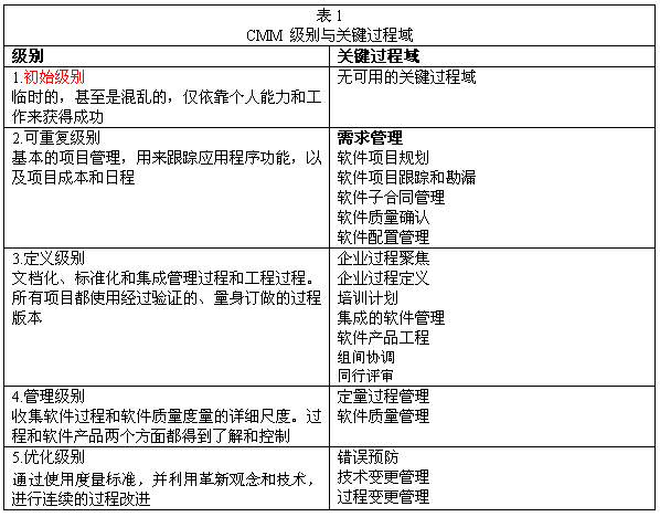 按照 CMM 的定义,过程改进使用"关键过程域"。它们影响到开发过程和最终软件质量的各个方面。表4 显示了 CMM 的 5 个级别和它们的关键过程域。显而易见,表1 表明从级别 1 升级到级别 2 必须用到的关键过程域是需求管理。CMM 的定位是:需求管理是达到过程成熟度的首要步骤之一。