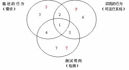 从理论上讲,上图中“需求”(S圆表示)、“可运行系统” (P圆表示)和“测试用例” (T圆表示)应该是重合,但实际上这三个圆很难重合。