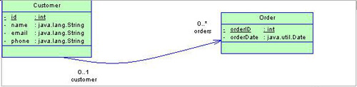 因此,对象图是类图的具体形式,表示类实例样本,并且显示了键值和关系。例如,CustomerBean 类具有以下客户实例:该客户的 ID 为 52271,姓名为“John Doe”。该客户实例与三个订单实例(三份订单)相关,订单编号分别为122047、122103 和 122399。