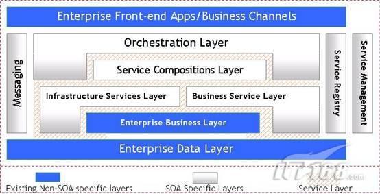 如前所述,这些SOA特有的层是追加的层,是夹在当前系统的既有层中间的层。图示中的层列是根据习惯以标准的方式堆排到一起的。顶层使用底层的服务来满足上面各层的需求与功能要求。