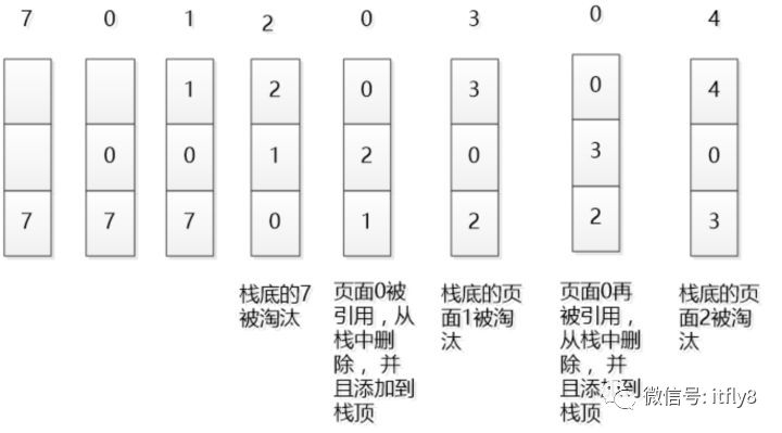 在一般标准的操作系统教材里,会用下面的方式来演示 LRU 原理,假设内存只能容纳3个页大小,按照 7 0 1 2 0 3 0 4 的次序访问页。假设内存按照栈的方式来描述访问时间,在上面的,是最近访问的,在下面的是,最远时间访问的,LRU就是这样工作的。