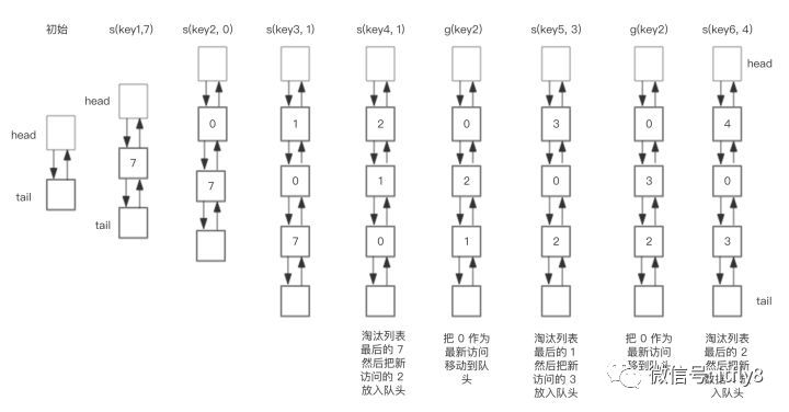 LRU 存储是基于双向链表实现的,下面的图演示了它的原理。其中 head 代表双向链表的表头,tail 代表尾部。首先预先设置 LRU 的容量,如果存储满了,可以通过 O(1) 的时间淘汰掉双向链表的尾部,每次新增和访问数据,都可以通过 O(1)的效率把新的节点增加到对头,或者把已经存在的节点移动到队头。