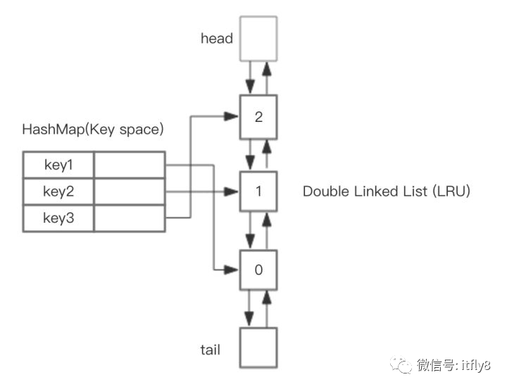 整体的设计思路是,可以使用 HashMap 存储 key,这样可以做到 save 和 get key的时间都是 O(1),而 HashMap 的 Value 指向双向链表实现的 LRU 的 Node 节点,如图所示。