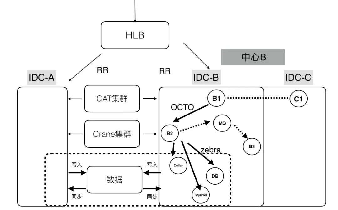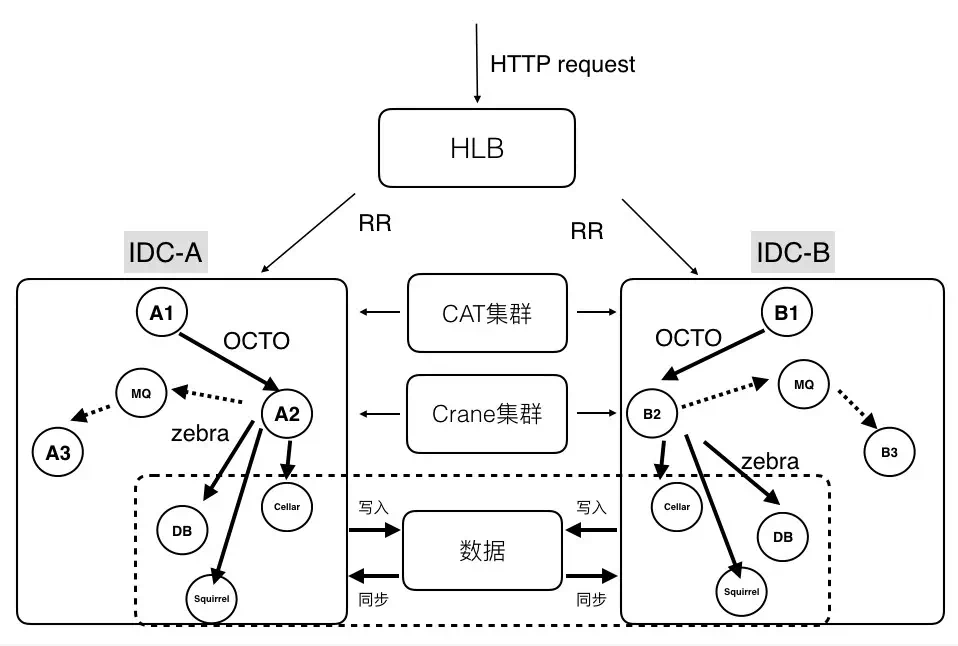 上图是比较典型的美团技术体系下的分布式系统结构:依托了美团公共组件和服务,完成了分区扩容、容灾和监控的能力。前端流量会通过 HLB 来分发和负载均衡;在分区内,服务与服务会通过 OCTO 进行通信,提供服务注册、自动发现、负载均衡、容错、灰度发布等等服务。当然也可以通过消息队列进行通信,例如 Kafka、RabbitMQ。在存储层使用 Zebra 来访问分布式数据库进行读写操作。利用 CAT(美团开源的分布式监控系统)进行分布式业务及系统日志的采集、上报和监控。分布式缓存使用 Squirrel+Cellar 的组合。分布式任务调度则是通过 Crane。(架构之家公众号:itfly8)