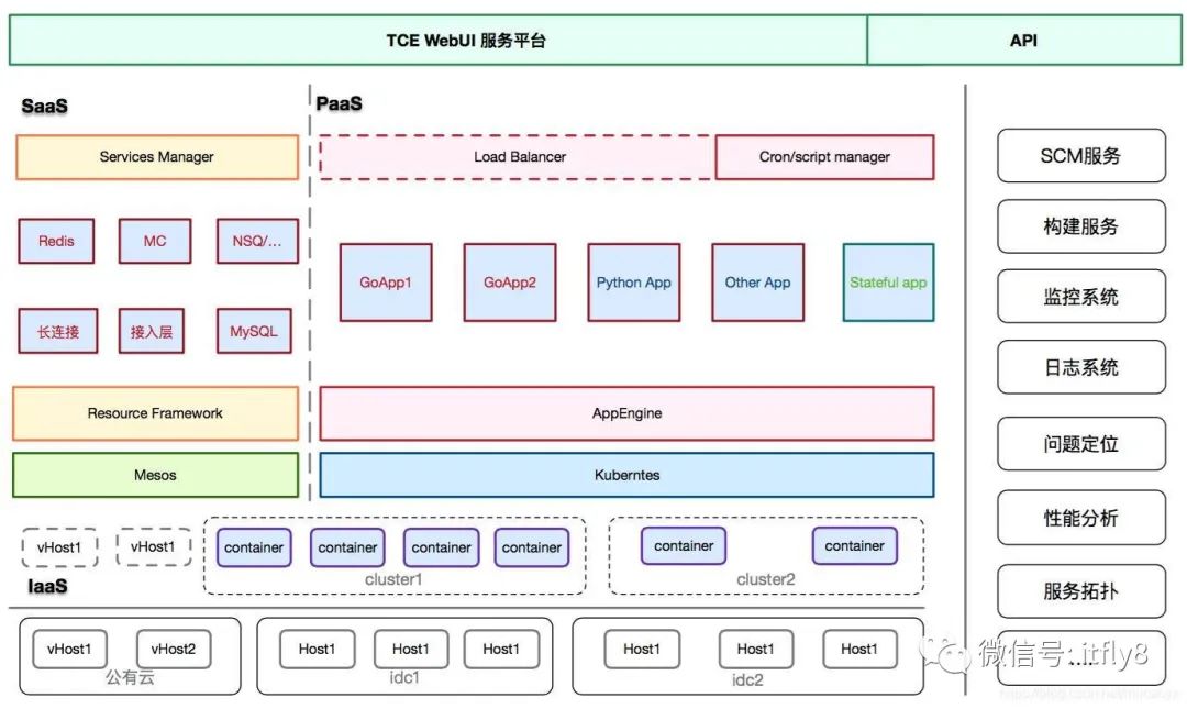 通过三层实现,通过 PaaS 平台统一管理。提供通用 SaaS 服务,同时提供通用的 App 执行引擎。最底层是 IaaS 层。