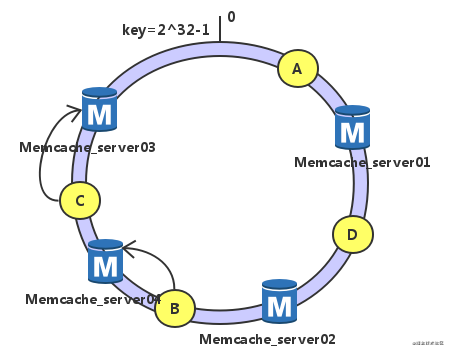 假设我们有3个节点和4个数据,其地址在哈希值空间的分布如下: