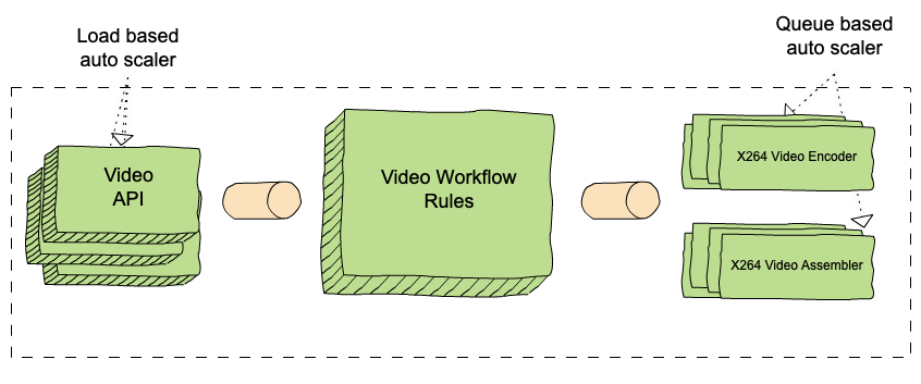 Cosmos 服务保留了微服务的强契约和相隔离的数据 / 依赖关系,但添加了多步工作流和计算密集型异步 Serverless 函数。下图展示了一个典型的 Cosmos 服务,在该服务中,客户端将请求发送到视频编码器服务的 API 层。一组规则编排工作流步骤,一组 Serverless 函数执行特定领域的算法。函数被打包为 Docker 镜像,并带有它们自己特定于媒体的二进制依赖项(例如 debian 包)。它们根据队列的大小进行扩缩容,可以在成千上万的不同容器上运行。请求可能需要数小时或数天才能完成。