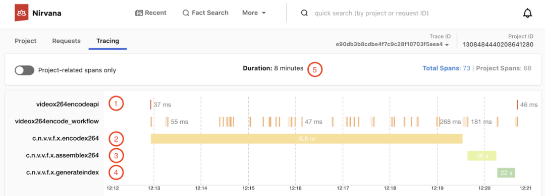 上图是我们的观察门户网站 Nirvana 的截图。它展示了 Cosmos 中的一个典型服务请求(在本例中是一个视频编码器服务):