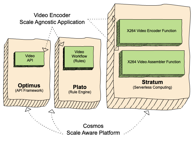 Cosmos 有两条分离轴。一方面,逻辑被划分为 API、工作流和 Serverless 函数。另一方面,逻辑在应用程序和平台之间也是分离的。平台 API 为应用程序开发人员提供了特定于媒体的抽象,同时隐藏了分布式计算的细节。例如,视频编码服务是由与扩缩容无关的组件构建的:API、工作流和函数。他们对自己的扩缩容没有特别的了解。这些特定于领域的、扩缩容不可知的组件构建在三个 扩缩容可感知的 Cosmos 子系统上,这些子系统负责处理分发工作的细节: