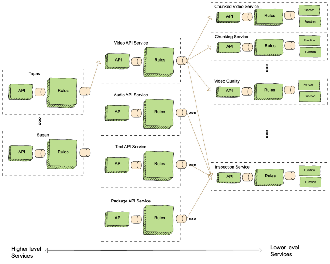 例如,上面提到的视频服务只是众多用于创建可在设备上播放的流的服务之一。这些服务还包括检查、音频、文本和包装,它们是用更高级别的服务精心编排的。其中最大、最复杂的是 Tapas,它负责从工作室获取资源,并使这些资源可以在 Netflix 服务上播放。另一个高级服务是 Sagan,它用于工作室的操作,如营销剪辑或日常制作编辑代理等。