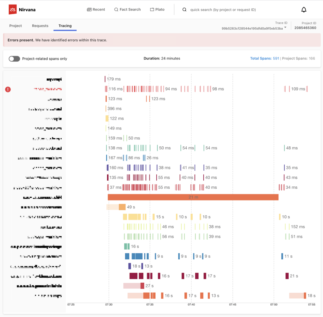 下面的跟踪示例展示了一个顶级服务中的请求是如何向下流到较低级别的服务中,从而导致许多不同操作的。在这种情况下,请求需要 24 分钟才能完成,数百个不同的行动涉及 8 个不同的 Cosmos 服务和 9 个不同的 Stratum 函数。