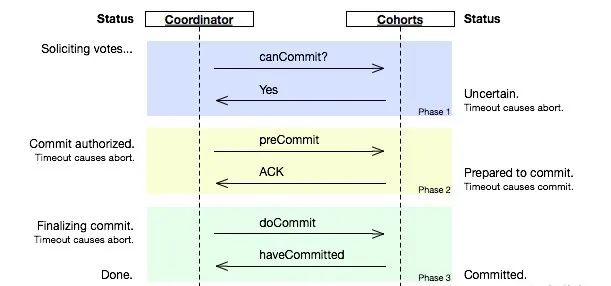 3 Phase Commit,三阶段提交,是二阶段提交的改进,系统也有两个角色协调者和参与者,事务提交过程分为三阶段: