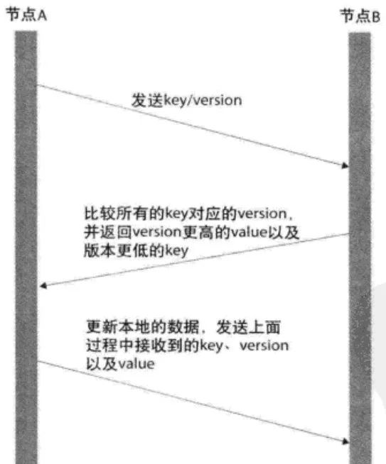 每个节点存放了一个key,value,version构成的列表,每隔一定的时间,节点都会主动挑选一个在线节点进行上图的过程(不在线的也会挑一个尝试),两个节点各自修改自己较为落后的数据,最终数据达成一致并且都较新。节点加入或退出都很容易。