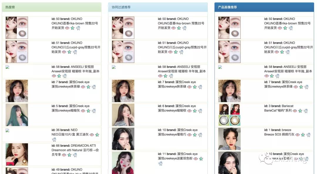 当前推荐结果分为3列,分别是热度榜推荐,协同过滤推荐和产品画像推荐