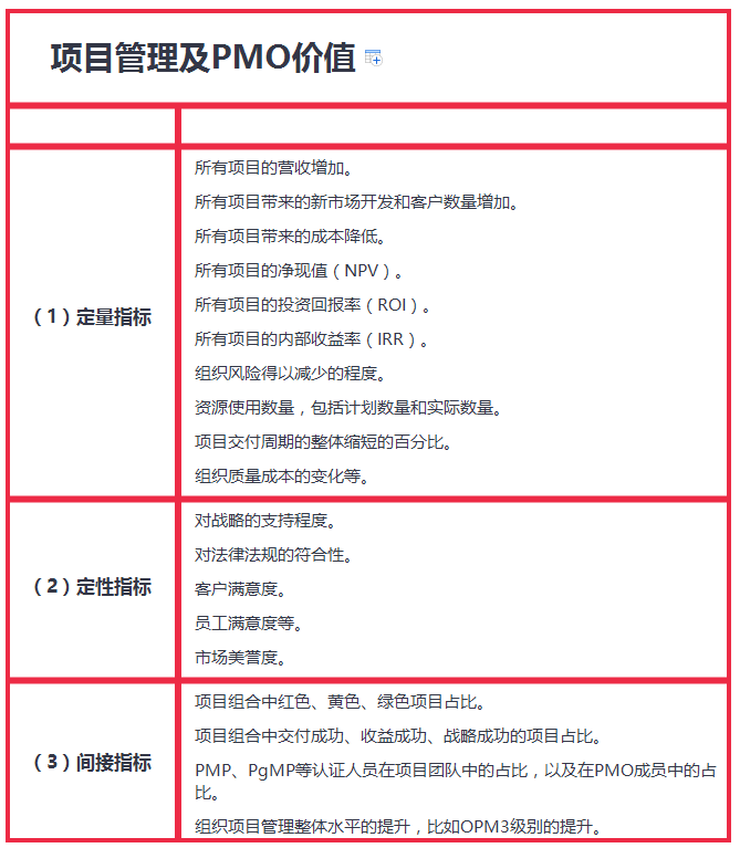 除了以上3个关键指标外,PMO还采用其他指标来彰显其价值,这些指标有的是定量的,有的是定性的;有的是直接指标,有的是间接指标。下面列举说明定量指标和定性指标。可以选择使用: