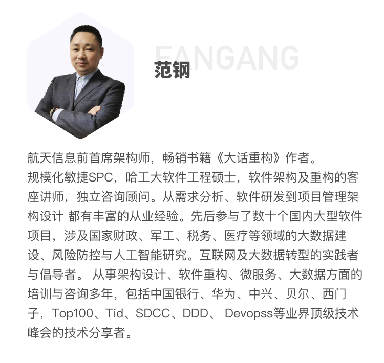 行业大咖级主讲,范钢,前航天信息首席架构师,畅销书《大话重构》作者。