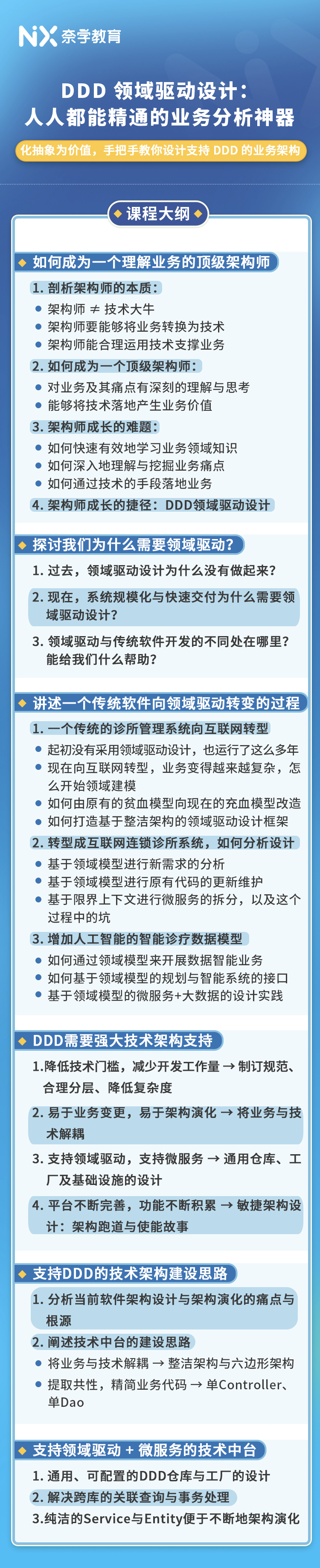 总之,通过 DDD 指导架构体系设计核心技术点,到企业 DDD 落地业务架构设计线,再到大型业务架构真实应用面的深度剖析,使得同学们全方面立体掌握 DDD 的本质,同时拥有百万年薪业务架构师的顶级思维模型。