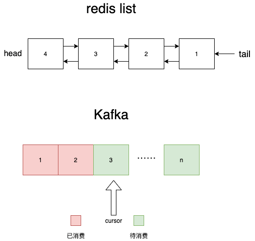 和redis list不同的是,首先kafka的topic(实际上是partion)是用的单向队列来存储数据的,新数据每次直接追加到队尾。同时它维护了一个游标cursor,从头开始,每次指向即将被消费的数据的下标。每消费一条,cursor+1 。通过这种方式,kafka也能和redis list一样实现先入先出的语义,但是kafka每次只需要更新游标,并不会去删数据。