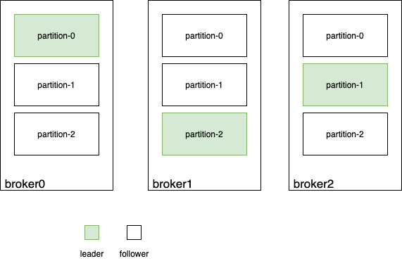 系统要容忍丢数据,最朴素也是唯一的办法就是做备份,让同一份数据复制到多台机器,所谓的冗余,或者说多副本。为此,kafka引入 leader-follower的概念。topic的每个partition都有一个leader,所有对这个partition的读写都在该partition leader所在的broker上进行。partition的数据会被复制到其它broker上,这些broker上对应的partition就是follower: