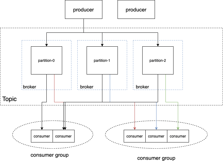 从这个图里我们可以看出,topic是一个逻辑上的概念,不是一个实体。一个topic包含多个partition,partition分布在多台机器上。这个机器,kafka中称之为broker。(kafka集群中的一个broker对应redis集群中的一个实例)。对于一个topic,可以有多个不同的消费组同时进行消费。一个消费组内部可以有多个消费者实例同时进行消费,这样可以提高消费速率。