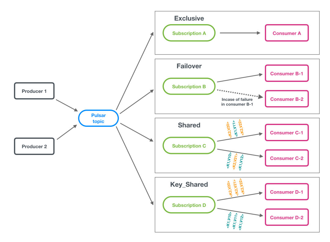 可以把pulsar的subscription看成kafka的consumer group,但subscription更进一步,可以设置这个”consumer group“的消费类型: