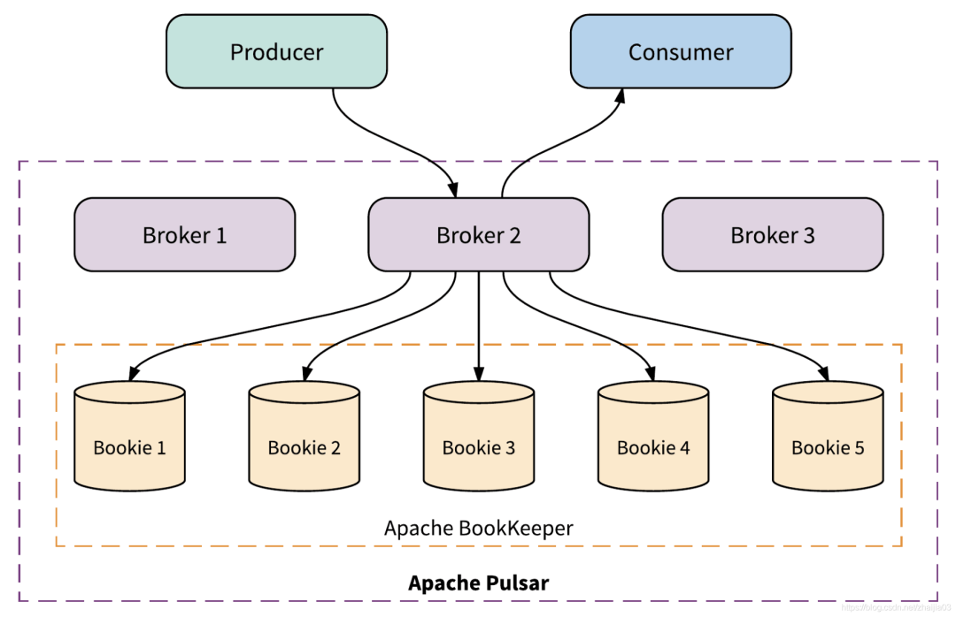 在pulsar中,broker的含义和kafka中的broker是一致的,就是一个运行的pulsar实例。但是和kafka不同的是,pulsar的broker是无状态服务,它只是一个”API接口层“,负责处理海量的用户请求,当用户消息到来时负责调用bookeeper的接口写数据,当用户要查询消息时从bookeeper中查数据,当然这个过程中broker本身也会做很多缓存之类的。同时broker也依赖于zookeeper来保存很多元数据的关系。