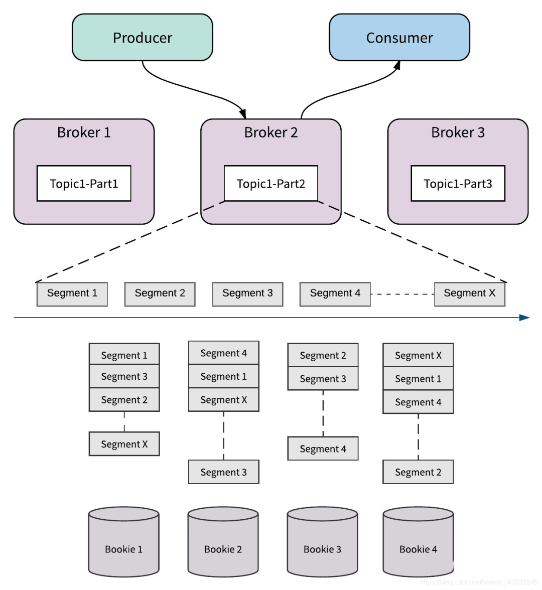 partition以segment为单位分散到整个bookeeper集群,没有单点,也可以轻易地扩容;