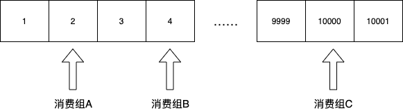 这里需要引入一个消费组的概念,这个概念非常简单,因为消费组本质上就是一组游标。对于同一个topic,不同的消费组有各自的游标。监控组的游标指向第二条,BI组的游标指向第4条,trace组指向到了第10000条……各消费者游标彼此隔离,互不影响。