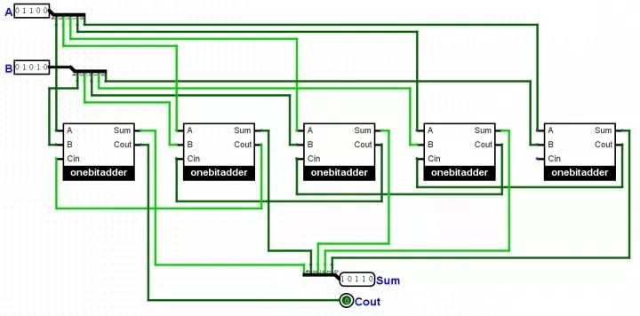 他把黑盒子里的零件全拿了出来,四人忙碌地工作着。很快,他们拥有了5个全加器,基于小红的设计连了起来: