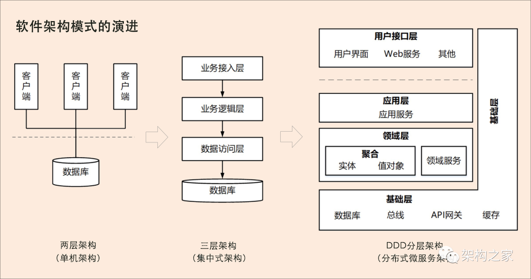 我们先不讨论DDD的定义, 先梳理一下DDD火起来的背景, 根据我学习的套路, 永远是为什么为先,再是解决什么问题,是什么东西, 最后如何使用。我们都知道这些年随着设备以及技术的发展,软件架构发生了很多变化,从最初的单机(BS/CS)架构到后面的集中式架构,再到如今的微服务架构, 现在基本可以说是微服务架构盛行的时代, DDD早在2004年就由埃里克·埃文斯提出, 但一直处于一个不愠不火的状态,直到Martin Fowler的《Microservices》引起大家注意, 也就是微服务盛行之后(这儿需要说明的是,微服务最早的提出者不是Martin Fowler,而是Fred George), DDD再次回到人们视野中间,为什么呢 ?