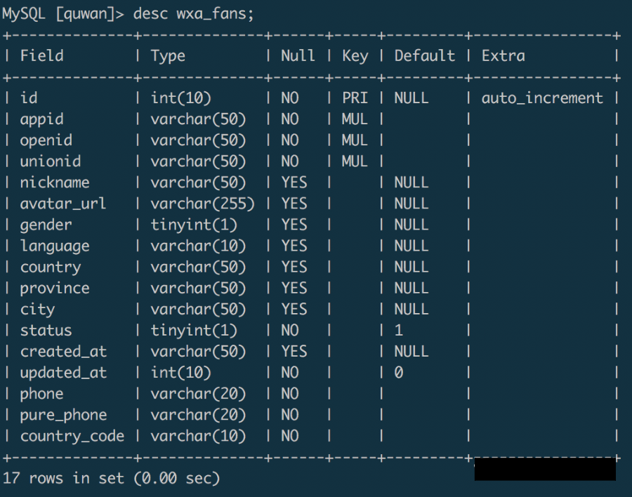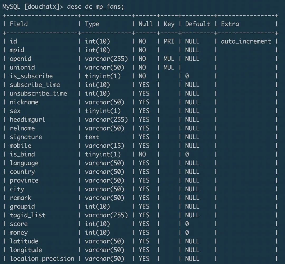 上面示例的从源数据库的dc_mp_fans表迁移数据到目标数据库的wxa_fans表,两个数据表的字段分别为: