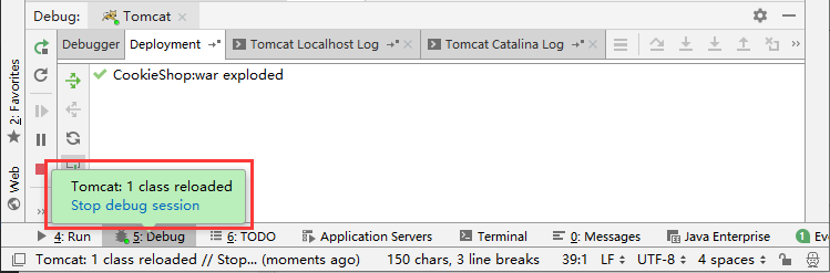 需要注意的是,IDEA中Tomcat热部署并非绝对实时, 还是会有延时的,假如你在调试程序过程中手速快的话可能会出现改了并没有马上生效的情况。此时先不要怀疑热部署没有配置成功,稍微等一会你会看到开发工具左下角会有一个class reload的提示,出现这个提示才说明已经热部署完成了。