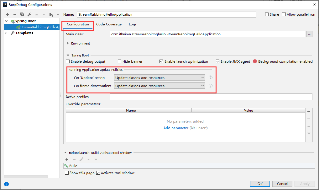 在左侧Spring Boot下拉选项中选中你要配置的程序,单击Configurations选项,将Running Application update Policies下的两个下拉框选择为 Update classes and resources。