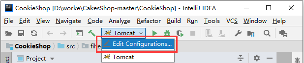 在IDEA顶部的程序运行操作栏找到服务器配置下拉框, 单击服务器配置下拉框中的Edit Configurations。