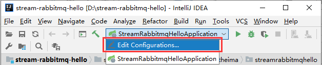 在IDEA顶部找到程序运行操作栏, 单击Edit Configurations。
