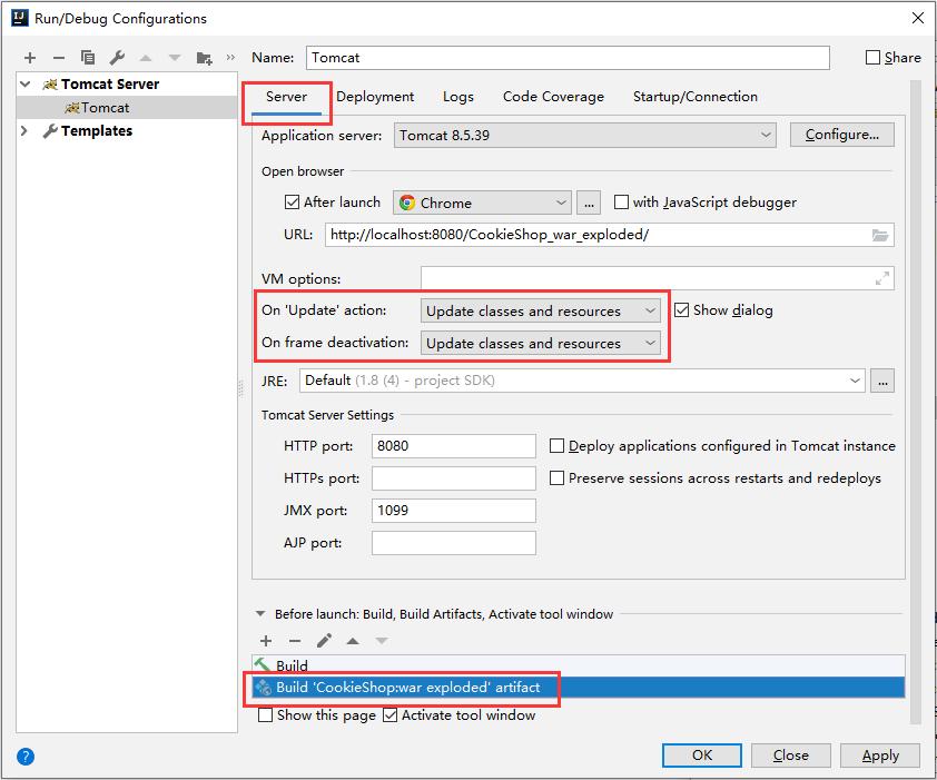 切换到Server界面,将VM options下的两个下拉框选择为 Update classes and resources;在Before launch:Build, Build Artifacts,Activate tool window选项下选择“Build'项目名:war_exploded'artifact”。