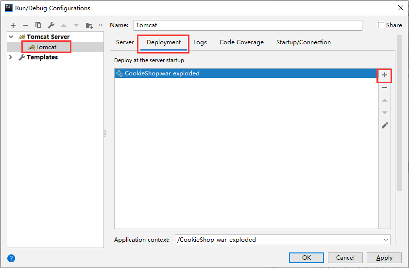 在左侧Tomcat Server下拉选项中选择你要配置的Tomcat,单击deployment,然后单击deployment界面右侧的 “+”,添加你要部署的war包,热部署必须要选择带有exploded后缀的war包。