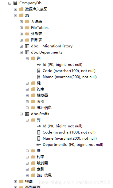 执行结果:生成数据结构如图。数据库名CompanyDb通过数据连接字符串进行了自定义得到的。